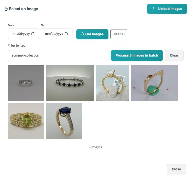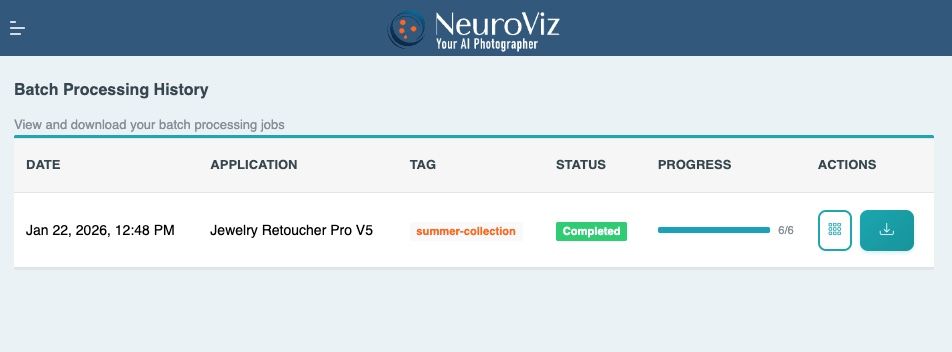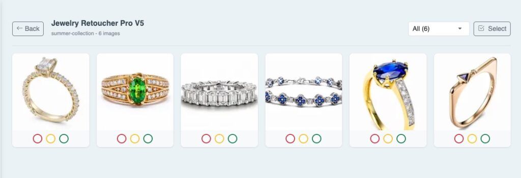 - The batch name helps you organize projects. Use descriptive names: “December Rings Catalog”, “Holiday Collection Retouching”, “Client Smith Wedding Bands”.