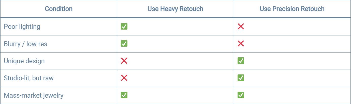 - 💡Use Heavy Retouch when your image is very poor, and the jewelry piece is relatively standard in shape and style.